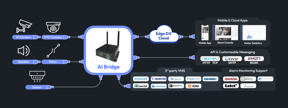 The schematic shows how AI BOX (AI Bridge) integrates security devices like cameras, sensors, speakers, and relays into one intelligent system. It processes data locally, connects to the Edge DX Cloud for analytics, supports mobile apps for real-time monitoring, integrates with APIs and third-party VMS, and links to alarm monitoring platforms. This makes AI BOX the central hub of a smart surveillance ecosystem.